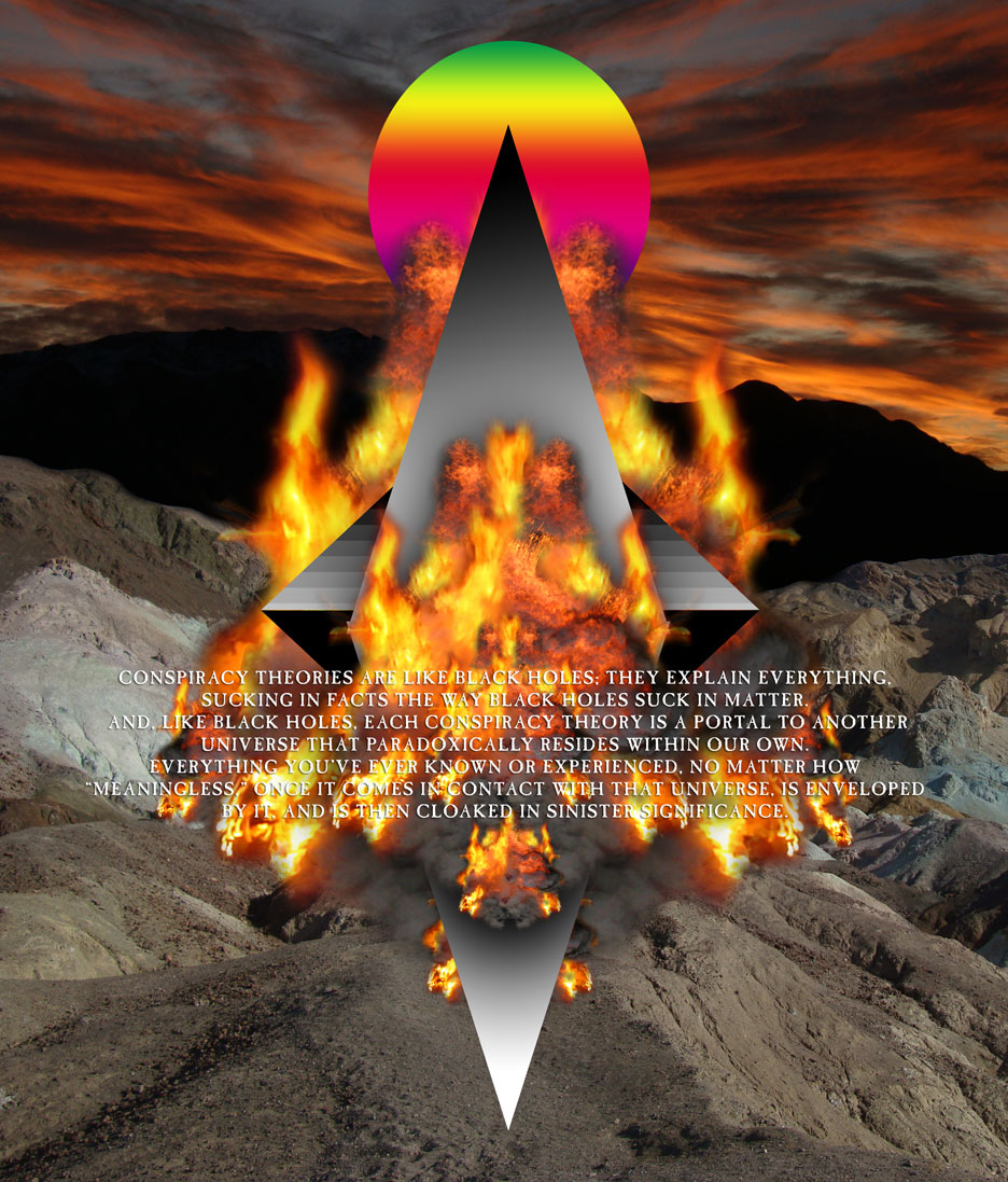 "Conspiracy theories are like black holes; they explain everything, sucking in facts the way black holes suck in matter. And, like black holes, each conspiracy theory is a portal to another universe that paradoxically resides within our own. Everything you've ever known or experienced, no matter how "meaningless," once it comes in contact with that universe, is enveloped by it, and is then cloaked in sinister significance."